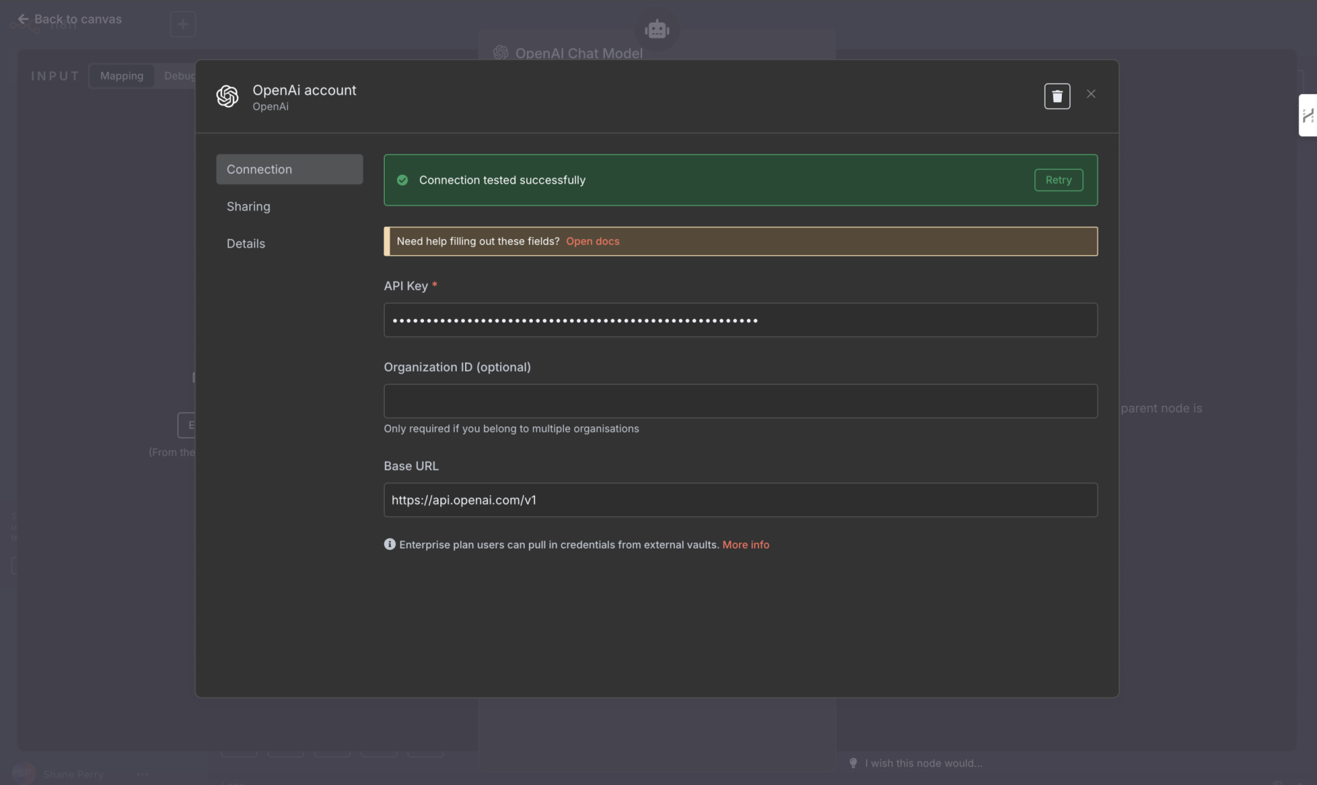 Tip: Hover over the node’s warning icon to identify missing or invalid credentials.
